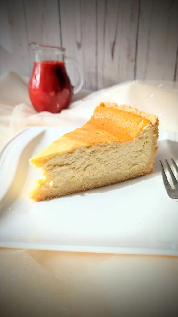 Ein Stück klassischer Käsekuchen mit goldgelber Oberfläche und Mürbeteigboden auf einem weißen Teller, serviert mit einer Kanne roter Erdbeersauce im Hintergrund. pin recipe