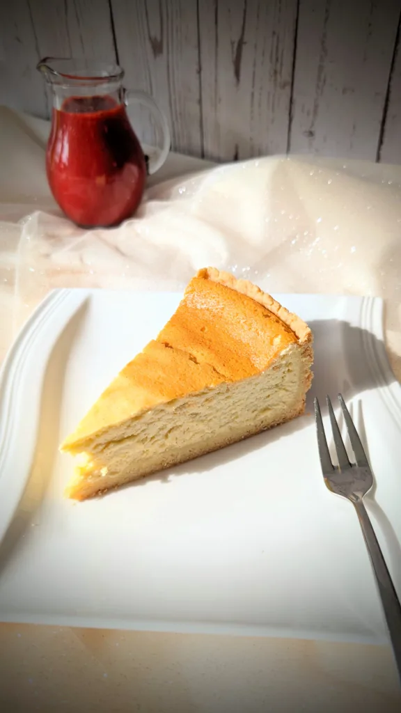 Ein Stück klassischer Käsekuchen mit goldgelber Oberfläche und Mürbeteigboden auf einem weißen Teller, serviert mit einer Kanne roter Erdbeersauce im Hintergrund. pinit View Gallery 3 photos